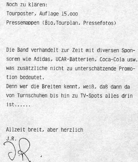 Hier noch ein tragischkomischer Leserbrief aus der Fanclubzeitung 1986 zum Album. Da hatte wohl jemand Angst, dass die Breiten wirklich so erfolgreich werden wie sie es planten. Aber man kann auch sehen, dass die Breiten schon immer die Nähe ihrer Hardcore Fans schätzten.